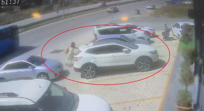 Hatay’da park halindeyken hareket eden aracı kazaya karışmadan tek eliyle durduran kadının faciayı önlediği anlar kameraya yansıdı.
