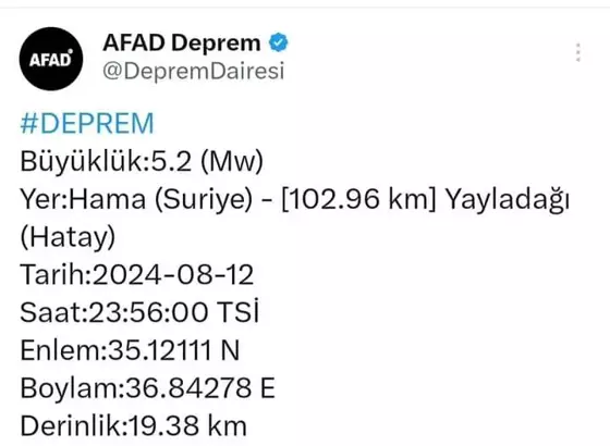 Afet ve Acil Durum Yönetimi Başkanlığı (AFAD) verilerine göre Suriye Hama kentinde saat 23.55’te 5.2 büyüklüğünde deprem kaydedildi. Deprem merkez üssüne 107 kilometre mesafede bulunan Hatay’ın yayladağı ilçesi ile kent genelinde de hissedildi. Yerin 19 kilometre derinliğinde meydana gelen depremle birlikte Hatay ve ilçelerinde bazı vatandaşlar sokaklara çıktı. Depremde ilk belirlemelere göre Türkiye sınırları içerisinde herhangi bir olumsuzluk yaşanmadı.