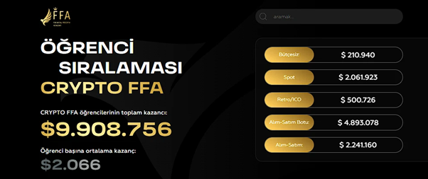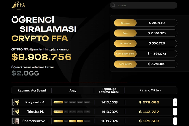 Zengin içerikli eğitim programı, karmaşık konuların sade bir dille anlatımı, pratiğe dayalı yaklaşım ve trading botu gibi unsurlar, yeni başlayanların bile minimum riskle kazanmaya başlamasını sağlıyor. Taha Can Sarı ve deneyimli uzmanlar ile analistlerden oluşan FFA ekibi, katılımcılara eğitimin her aşamasında destek veriyor ve kripto para ticaretinin karmaşık yönlerini anlamalarına yardımcı oluyor.