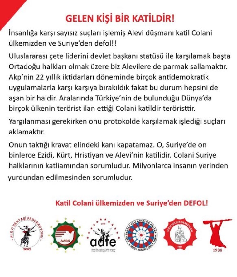 “Uluslararası çete liderini devlet başkanı statüsü ile karşılamak başta Ortadoğu halkları olmak üzere biz Alevilere de parmak sallamaktır.