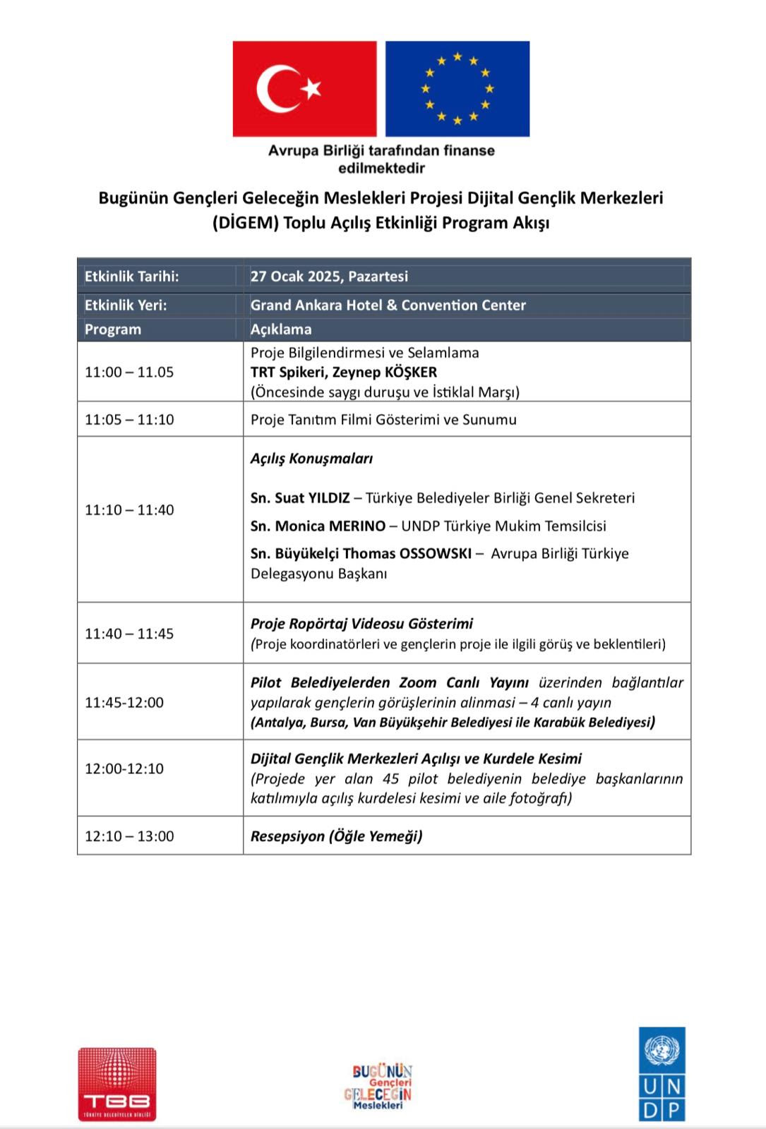 Avrupa Birliği finansmanıyla Birleşmiş Milletler Kalkınma Programı (UNDP) ve Türkiye Belediyeler Birliği (TBB) iş birliğinde yürütülen Bugünün Gençleri Geleceğin Meslekleri Projesi kapsamında 45 belediyede kurulan Dijital Gençlik Merkezleri – DİGEM’lerin toplu açılışı 27 Ocak 2025 Pazartesi günü Ankara’da düzenlenecek etkinlikle yapılacak.