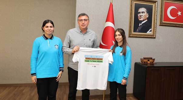 Öğrenciler, daha sonra üzeninde kampanyanın adının yer aldığı tişörtü Başkan Mehmet Dönmez’e hediye etti.