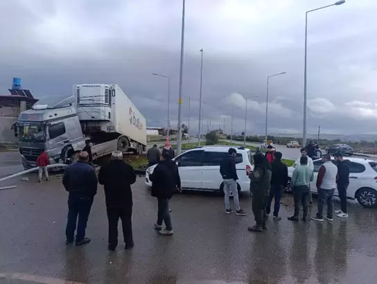 Reyhanlı ilçesinde önündeki kamyonete çarpmamak için manevra yapınca refüje çıkan TIR’ın şoförü hafif yaralandı.