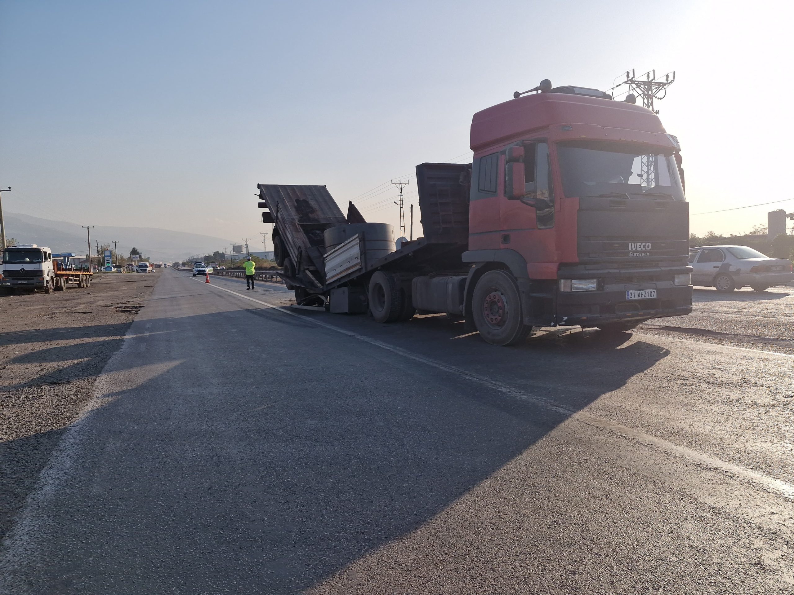 HATAY (İHA) – Hatay’da saç taşıyan seyir halindeki tırın dorsesi ağırlıkla birlikte ikiye bölündü.