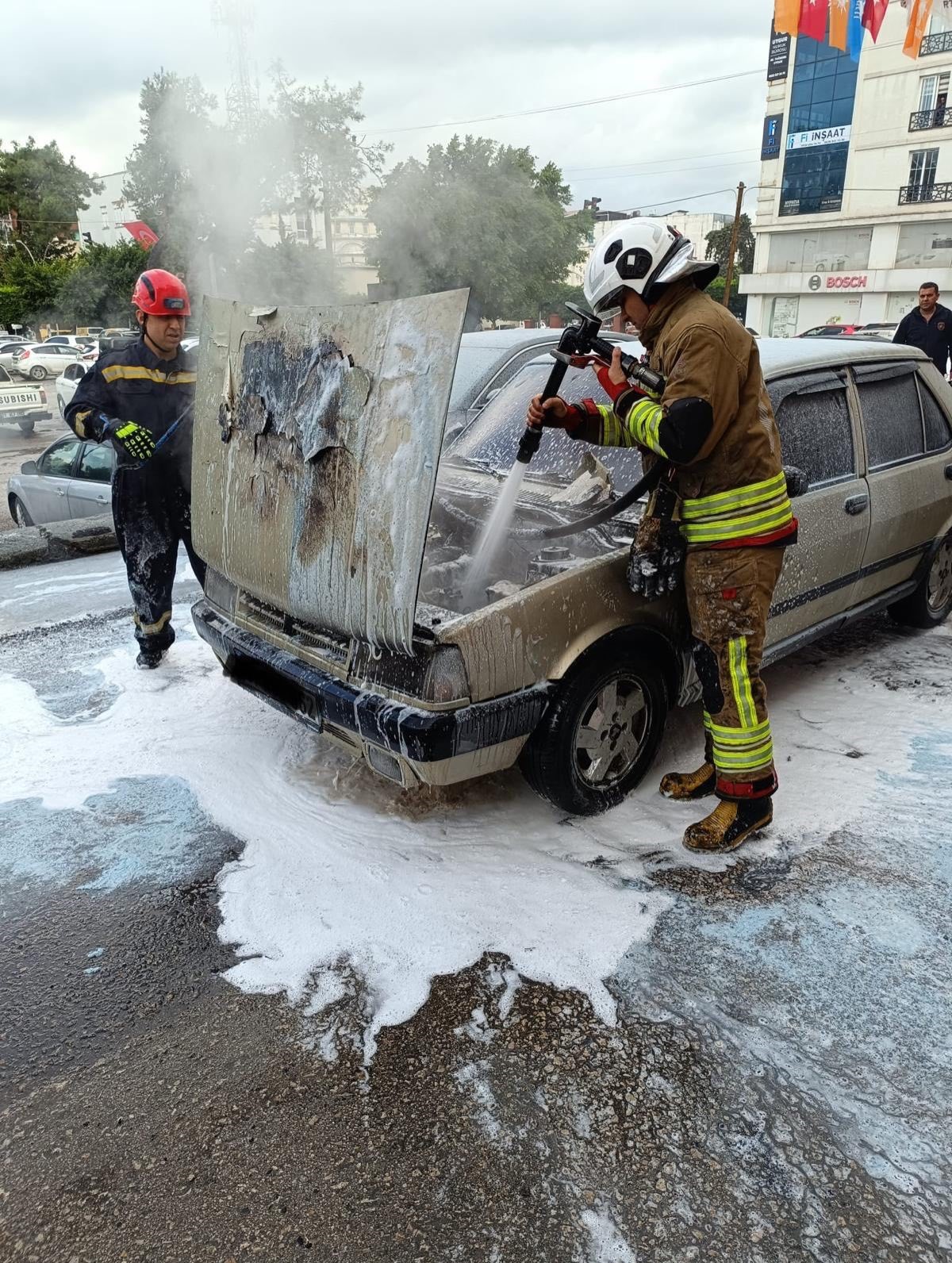 HATAY (İHA) – Hatay’da motor kısmı alevlere teslim olan TOFAŞ marka otomobilin motor kısmı alevlere teslim oldu.
