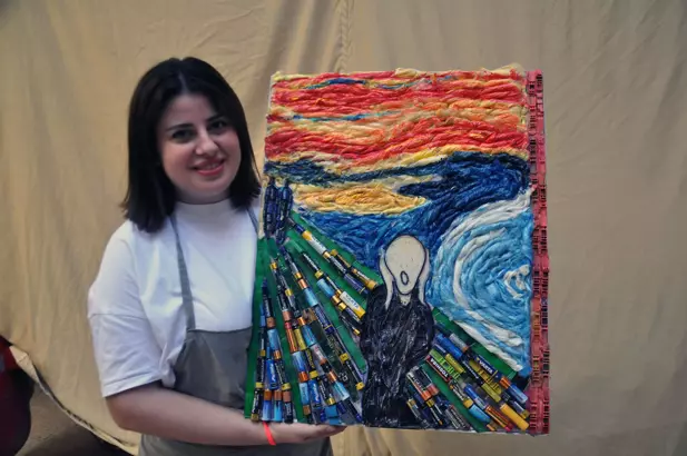 Reyhanlı ilçesinde üniversite öğrencisi Dilara Altınorak Matracı (24), topladığı atık malzemeler ile ünlü ressamların tablolarını yapıyor.