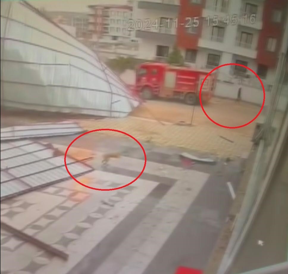 HATAY (İHA) – Hatay’da kuvvetli fırtınanın yerinden söktüğü metal çatının kendisine isabet etmesinden koşarak kurtulan vatandaşın ölüme saniyeler kala verdiği mücadele güvenlik kamerasına yansıdı.