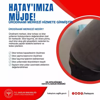 İdrar yolu hastalıklarının teşhis ve tedavisinde daha etkili yöntemlerin sağlanabileceği Ürodinami Merkezi, Hatay Eğitim ve Araştırma Hastanesi bünyesinde hizmet vermeye başladı. İl Sağlık Müdürü Sıtkı Sönmez, çalışmalar hakkında bilgi verdi. Sönmez, “İdrar kaçırma, sık idrara çıkma, zayıf idrar akışı gibi şikayetlerin nedenleri bu merkezde yapılan testlerle belirlenir ve tedavisi planlanır. İdrar torbası kapasitesi ve idrar yapma basıncını ölçebilecek, idrar yollarındaki tıkanıklıkları tespit edebilecek, ilaçların idrar yolları üzerindeki etkilerini değerlendirebilecek olan merkezimiz Hatay’a hayırlı uğurlu olsun” dedi.
