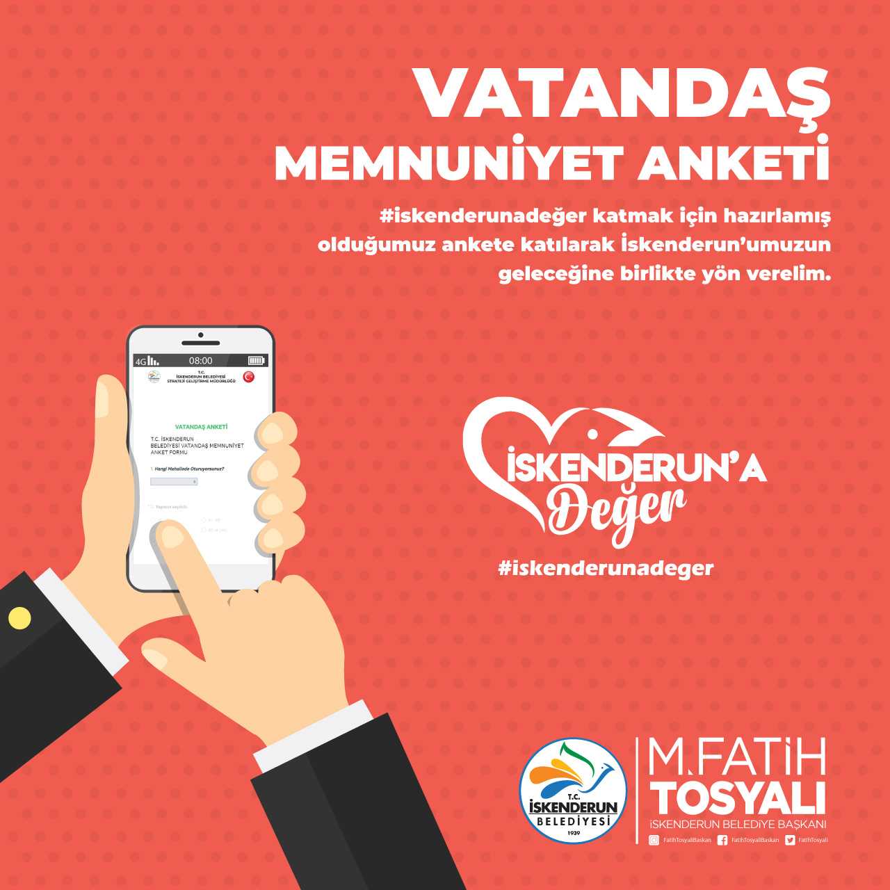 Başkan Tosyalı,“Kıymetli hemşerilerim #iskenderunadeğer katmak için hazırlamış olduğumuz ankete katılarak İskenderun’umuzun geleceğine birlikte yön verelim.Ankete katılmak için : http://www.iskenderun.bel.tr/vatandas bu link kullanılmaktadır”şeklinde konuştu.