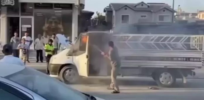 Hatay’da bir kamyonetin motor kısmında çıkan yangına mahalleli müdahale etti. Bu sırada bir kişi, çalkaladığı gazlı içecekle alevleri söndürmeye çalıştı.