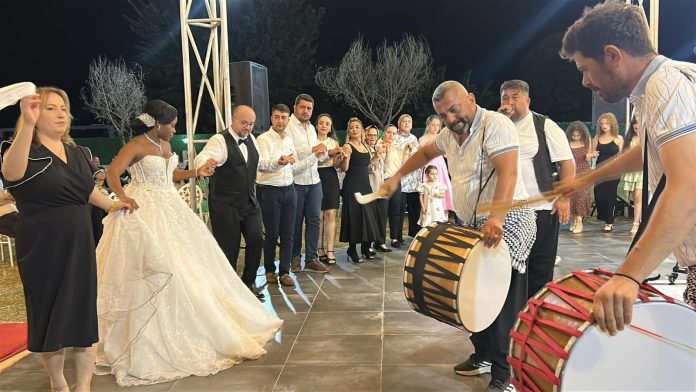 Hatay’da yaşayan Bayram Oğuz Yıldızhan, Ganalı Gifty Adams ile renkli görüntülerin oluştuğu düğünle evlendi. Davul ve zurna eşliğinde yapılan düğünde Ganalı gelin ve ailesi, çifte telli oynayarak ve halay çekerek düğünün tadını çıkarttı.