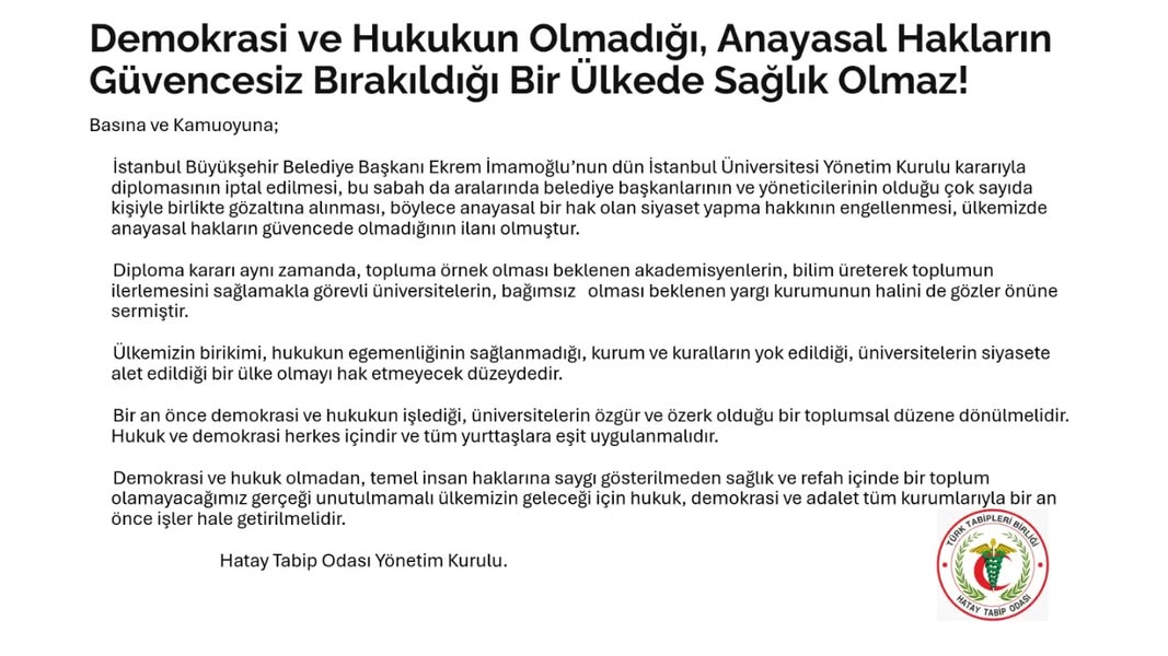 Hatay Tabip Odası Yönetim Kurulu yazılı bir açıklama yaparak İBB Başkanı   Ekrem İmamoğlu’nun önce diplomasının iptal edilmesi sonrada göz altına alınmasına tepki gösterdi. Açıklamada  yapılanlar “siyaset yapma hakkının engellenmesi” olarak değerlendirilerek şu görüşlere yer verildi: