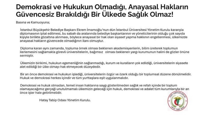 Hatay Tabip Odası Yönetim Kurulu yazılı bir açıklama yaparak İBB Başkanı   Ekrem İmamoğlu’nun önce diplomasının iptal edilmesi sonrada göz altına alınmasına tepki gösterdi. Açıklamada  yapılanlar “siyaset yapma hakkının engellenmesi” olarak değerlendirilerek şu görüşlere yer verildi: