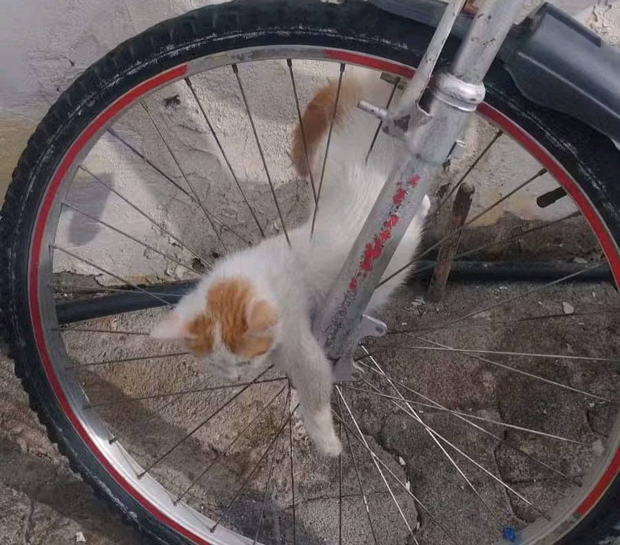 İskenderun ilçesi Cumhuriyet Mahallesi’nde bir yavru kedi, bisiklet tekerleğinin jant teline sıkıştı.
