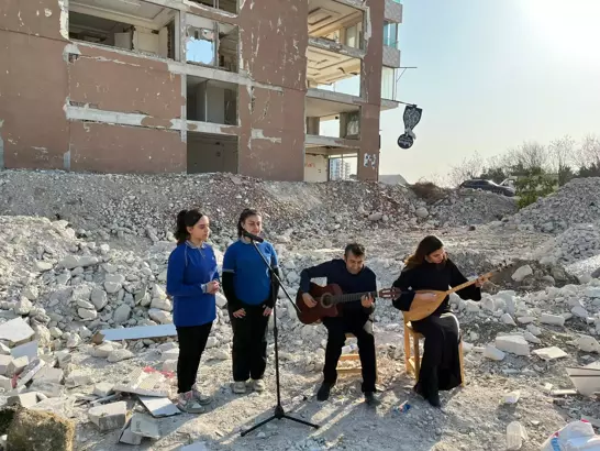 İlçedeki Jan ve Suphi Beyluni Lisesi öğrencileri, öğretmenlerinin eşliğinde depremin izlerini taşıyan yıkıntılar arasında Yemen Türküsü’nü seslendirerek depremde hayatını kaybettiklerini yad etti.