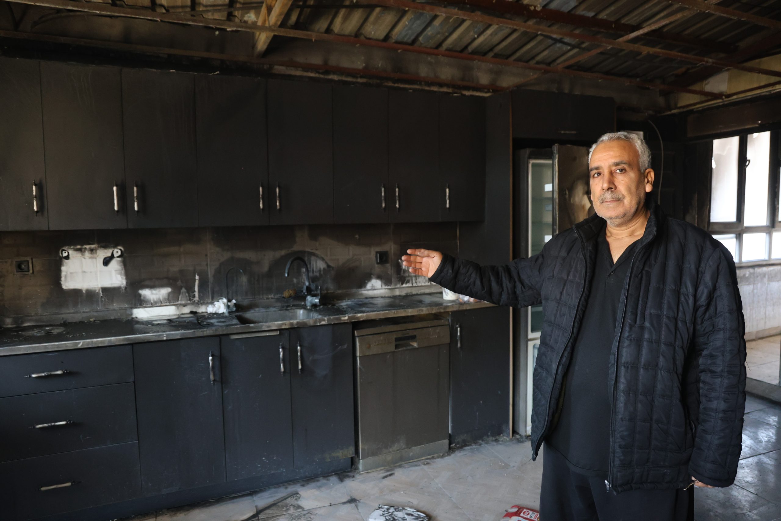 Hatay’da depremde evi yıkılan Ali Kaba ve ailesinin yaşadıkları yeni evleri, çıkan yangında zarar gördü.