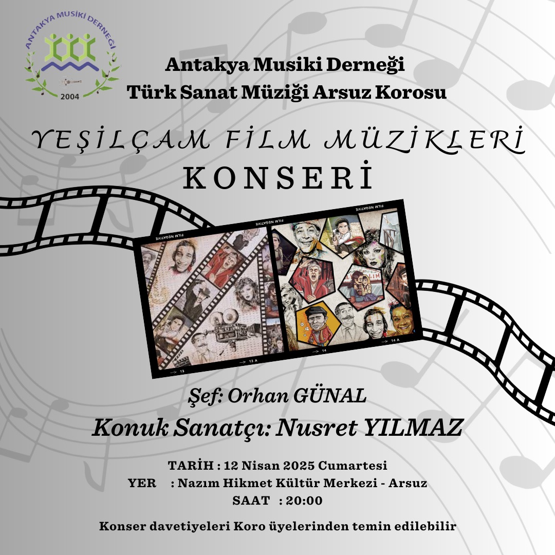 Antakya Musiki Derneği Türk Sanat Müziği Arsuz Korosu, 12 Nisan 2025 Cumartesi günü Arsuz ilçesi Nazım Hikmet Kültür Merkezi’nde sanatseverlerle buluşacak. “Yeşilçam Film Müzikleri” temasıyla sahne alacak olan koro, Türk sinemasına damga vurmuş filmlerin hafızalara kazınan şarkılarını seslendirecek.