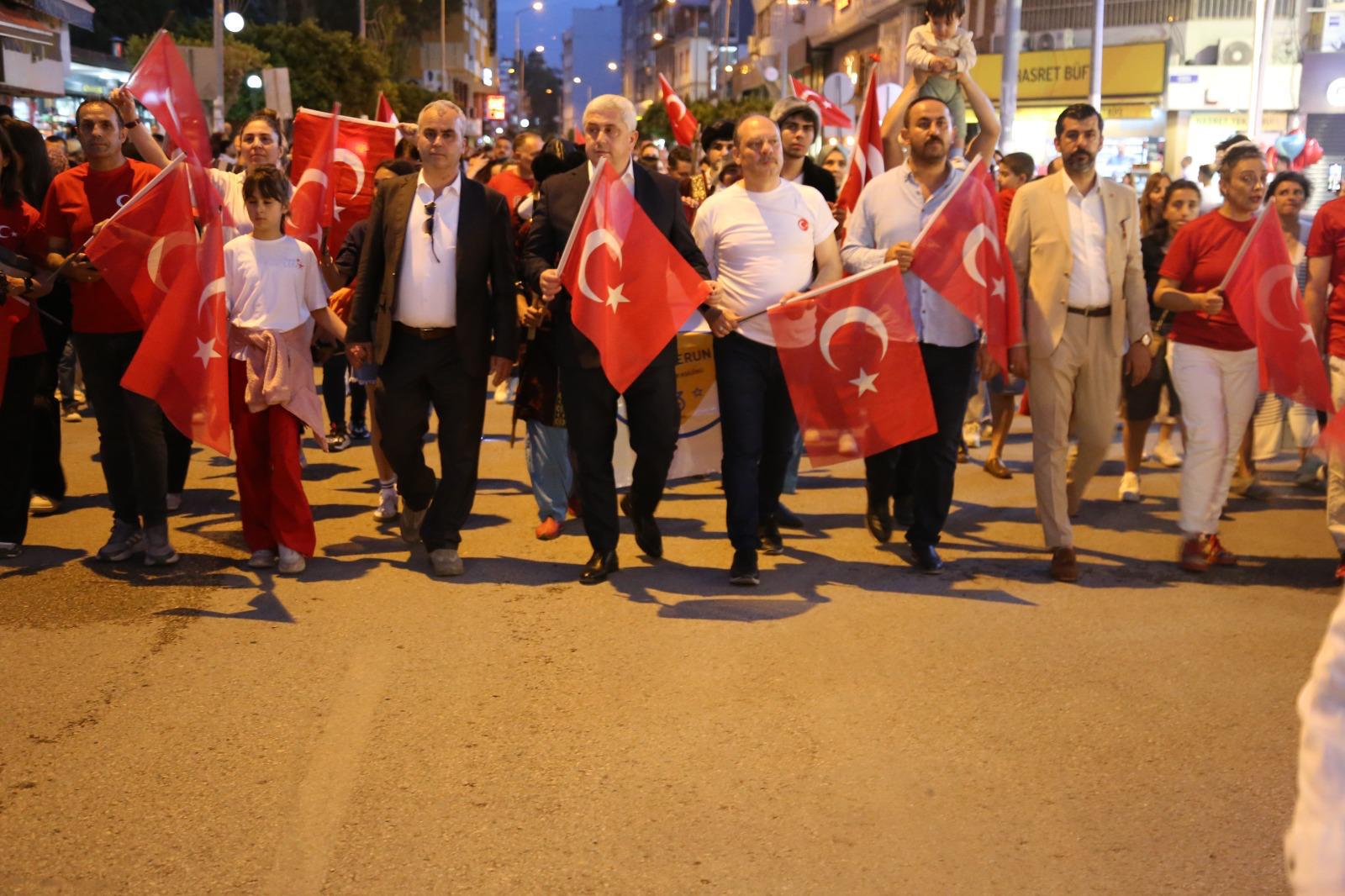 Yükseliş Koleji Bandosu eşliğinde İskenderun Kaymakamlık binası önünden başlayan yürüyüş, milli birlik ve beraberlik duygularının pekiştirildiği anlamlı anlara sahne oldu.