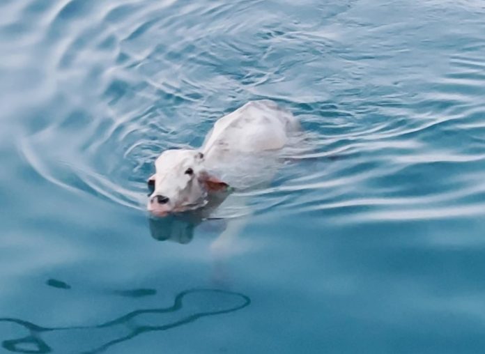 Denize düşen angus yüzerek kaçmaya çalıştı
