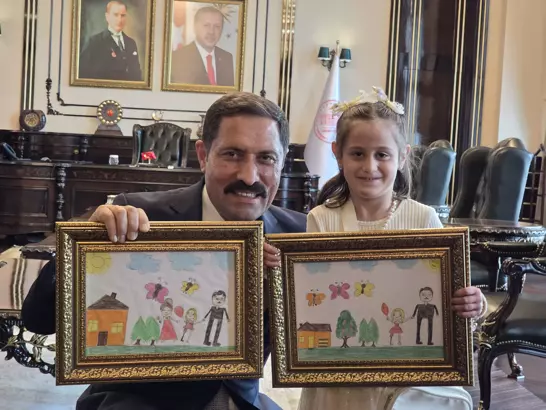 Hatay Valisi Mustafa Masatlı, “Bugün Valiliğimizde bir evladımızı ağırlıyoruz. Adı Zeynep. Ama ömrüne, birçok insanın bir hayata sığdıramayacağı kadar büyük bir acı sığmış bir yavrumuz. Asırların felaketi 6 Şubat ve devamındaki depremlerde annesini, babasını, 4 kardeşini ve sağ bacağını kaybetti. Hatay Engelli Sosyal Girişimcilik Merkezimizde, Zeynep kızımızın kendi isteğine göre tasarlanmış protez bacağına kavuştuğu o ilk ana, eşim ile birlikte şahitlik etmiştik. O gün aslında yalnızca bir protez takılmadı bir evladımızın hayata yeniden tutunma ümidi yeşerdi. Ve bize, kendi elleriyle çizdiği resimleri hediye etti. O resimlere baktığınızda yalnızca renkleri görmüyorsunuz; bir çocuğun susarak anlattığı acıyı, sevgiyi, özlemi ve yeniden yaşama tutunma gayretini görüyorsunuz. Bazı hediyeler vardır, duvara asılır. Bazıları ise doğrudan kalbe asılır. Zeynep kızımızın bugün bize verdiği resimler, işte böylesine bir emanettir. İnanıyorum ki o küçük ellerin çizdiği bu resimler, ömrümüz boyunca hafızamızda ve yüreğimizde yaşayacaktır” dedi.